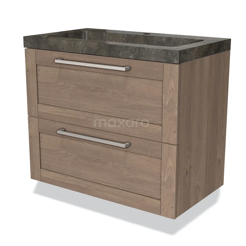 Badmöbel 80cm Modulo mittelbraune Eiche 2 Schubladen Rahmen Waschbecken Naturstein Blaustein