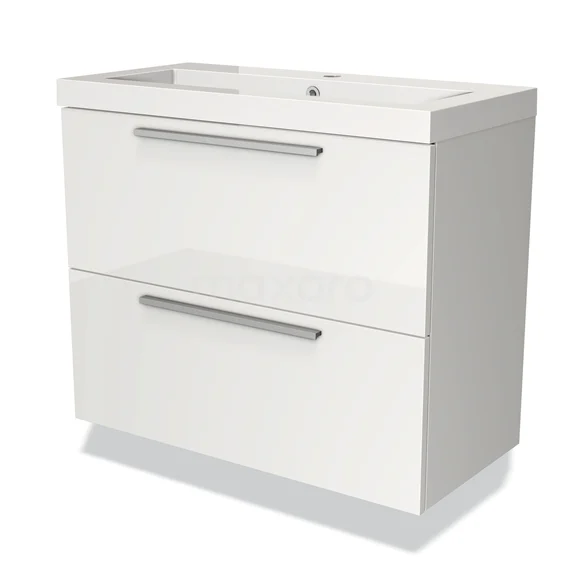Badmöbel 80cm Modulo Slim Hochglanz Weiß 2 Schubladen Flaches Waschbecken Mineralguss