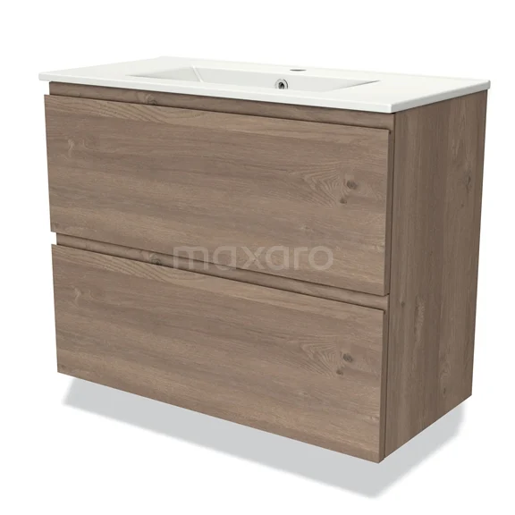Badmöbel 80cm Modulo Slim Mittelbraune Eiche 2 Schubladen Griffloses Waschbecken Keramik