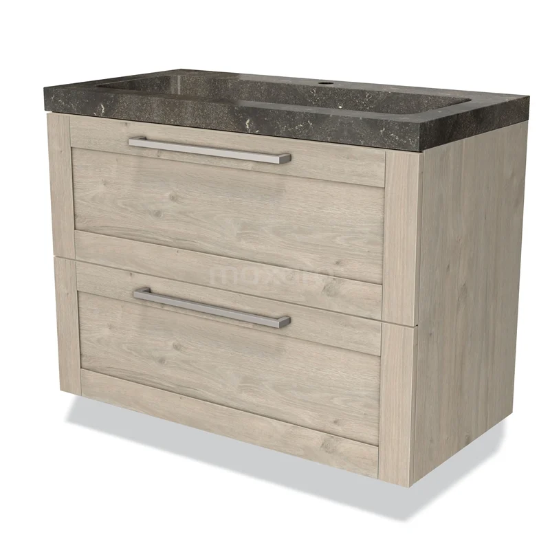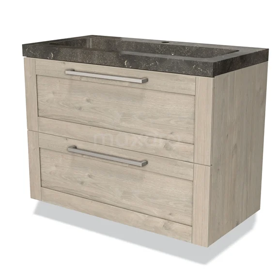 Badmöbel 90cm Modulo hellgraue Eiche 2 Schubladen Rahmen Waschbecken Naturstein