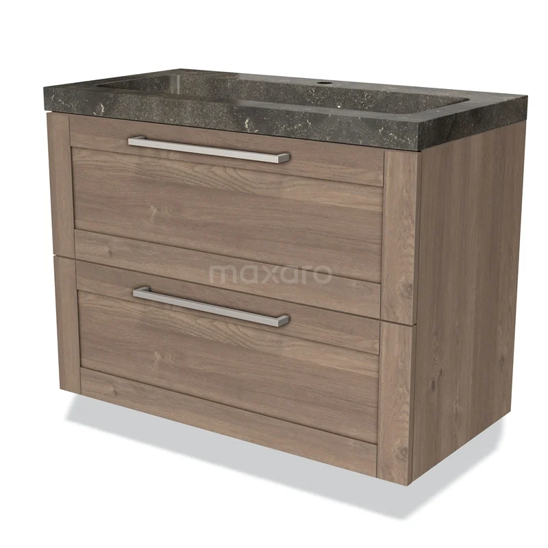 Badmöbel 90cm Modulo mittelbraune Eiche 2 Schubladen Rahmen Waschbecken Naturstein