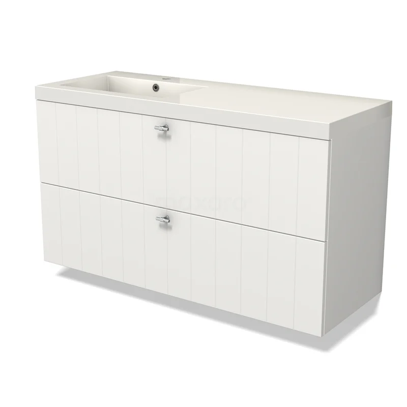 Das bodenstehende Badmöbel (120 cm) ist das Herzstück für die tägliche Körperpflege wie Schminken, Rasieren oder Zähneputzen. Das Waschbecken hat 2 Hahnlöcher und ist ideal für die gleichzeitige Nutzung durch mehrere Personen. Das Möbel bietet außerdem genügend Platz, um Ihre WC- und Pflegeprodukte ordentlich zu verstauen.
