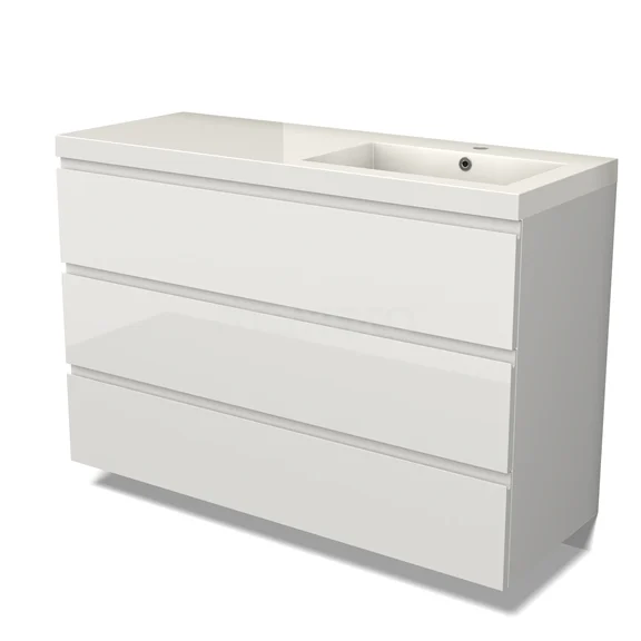 Das bodenstehende Badmöbel (120 cm) ist das Herzstück für die tägliche Körperpflege wie Schminken, Rasieren oder Zähneputzen. Das Waschbecken hat 2 Hahnlöcher und ist ideal für die gleichzeitige Nutzung durch mehrere Personen. Das Möbel bietet außerdem genügend Platz, um Ihre WC- und Pflegeprodukte ordentlich zu verstauen.