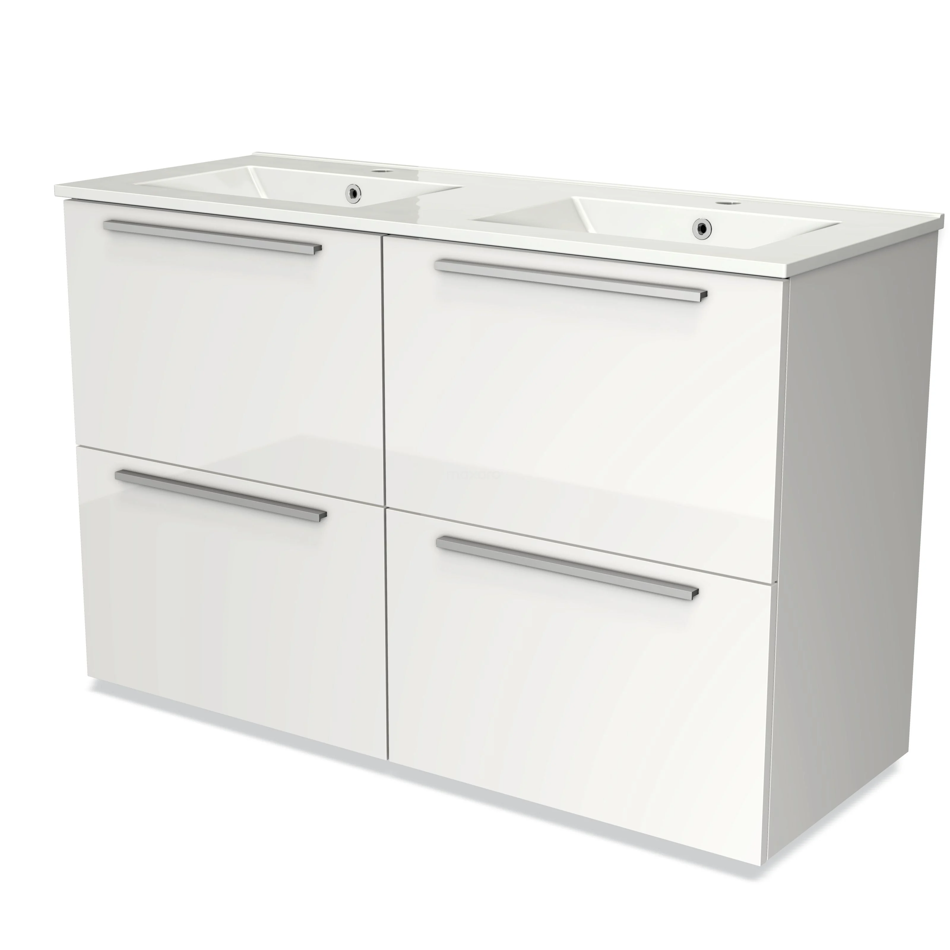Doppelte weiße Badmöbelset mit integrierten Waschbecken, modernen Chromgriffen und 4 geräumigen Schubladen der Elegance-Serie.