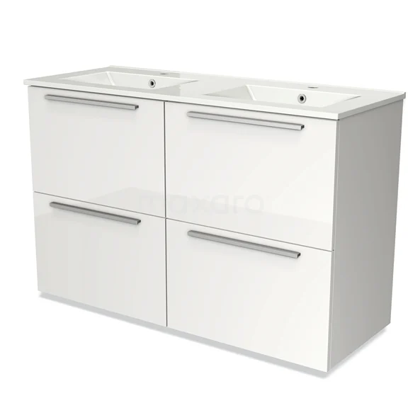 Hochglanz-Badmöbel 120cm Modulo Hochglanz Weiß 4 hohe Schubladen Flaches Waschbecken aus Keramik