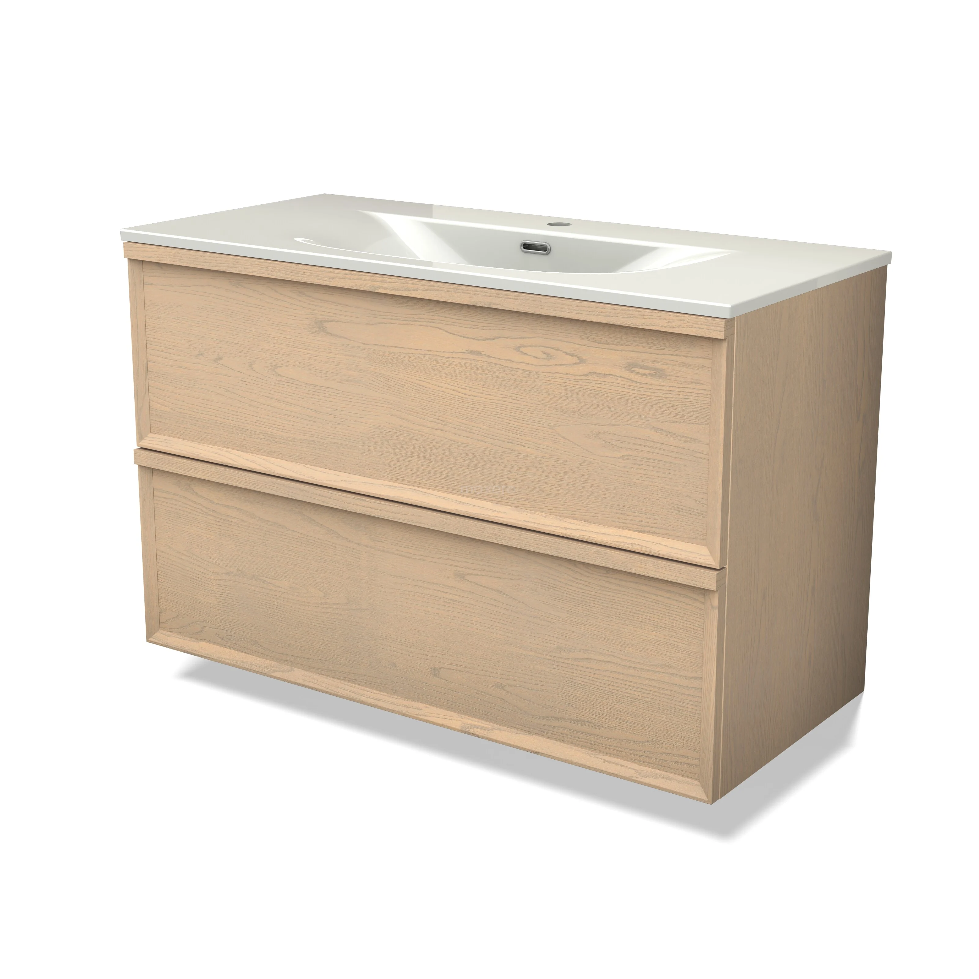 Modulo Plus Waschtische | 100 cm Natürliche Eiche Gesichtspunkt front Keramik 2 übereinanderliegende Schubladen