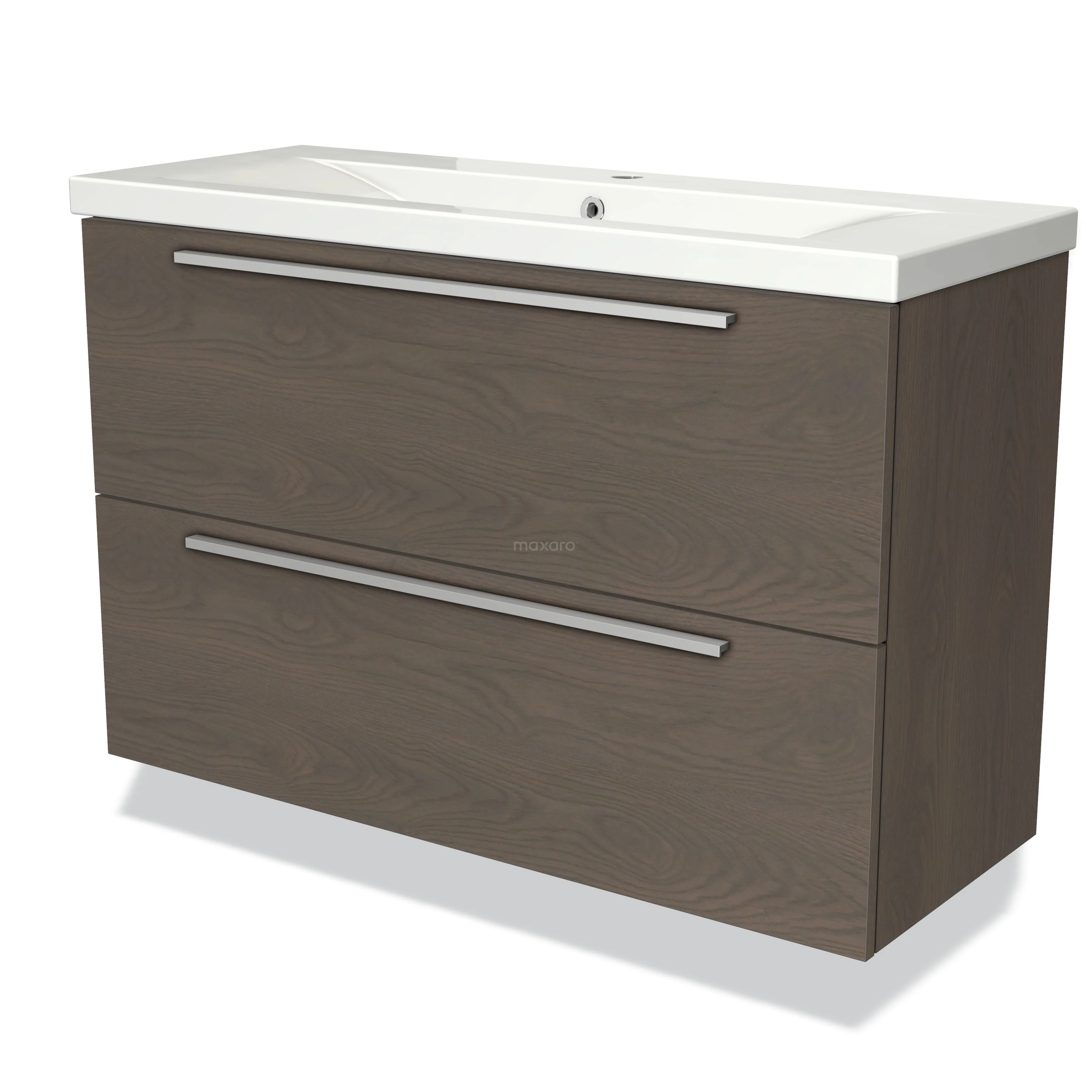 Modulo Slim Waschtische | 100 cm Dunkelbraune Eiche Flach front Keramik 2 übereinanderliegende Schubladen