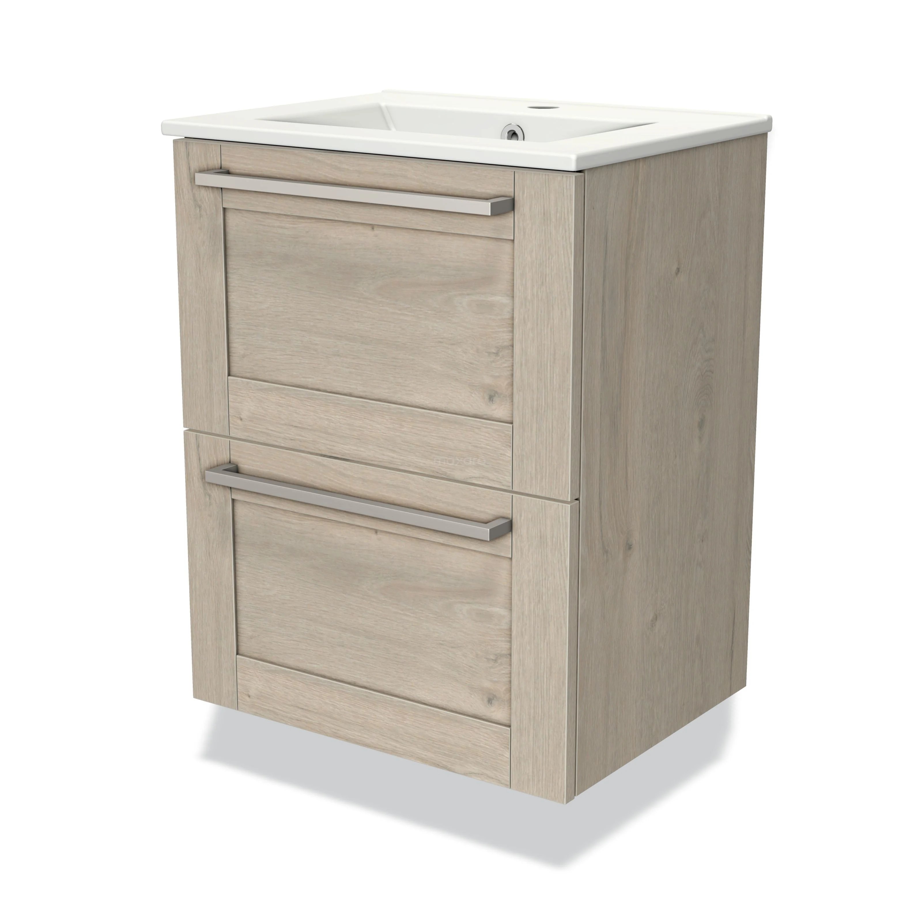 Modulo Slim Waschtische | 50 cm Hellgraue Eiche Rahmen front Keramik 2 übereinanderliegende Schubladen