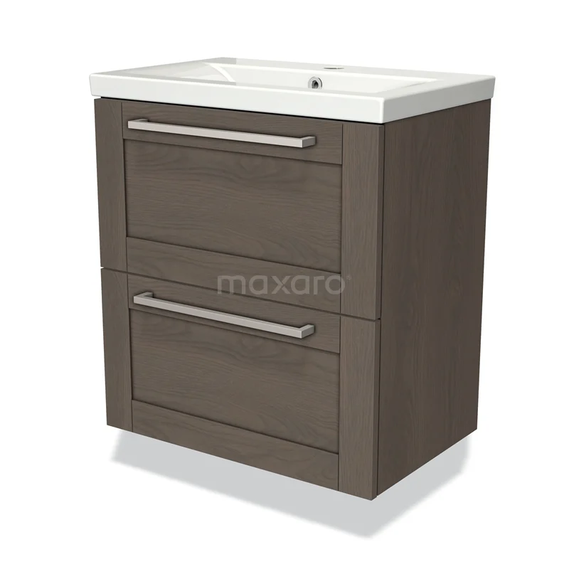 Modulo Slim Waschtische | 60 cm Dunkelbraune Eiche Rahmen front Keramik 2 übereinanderliegende Schubladen
