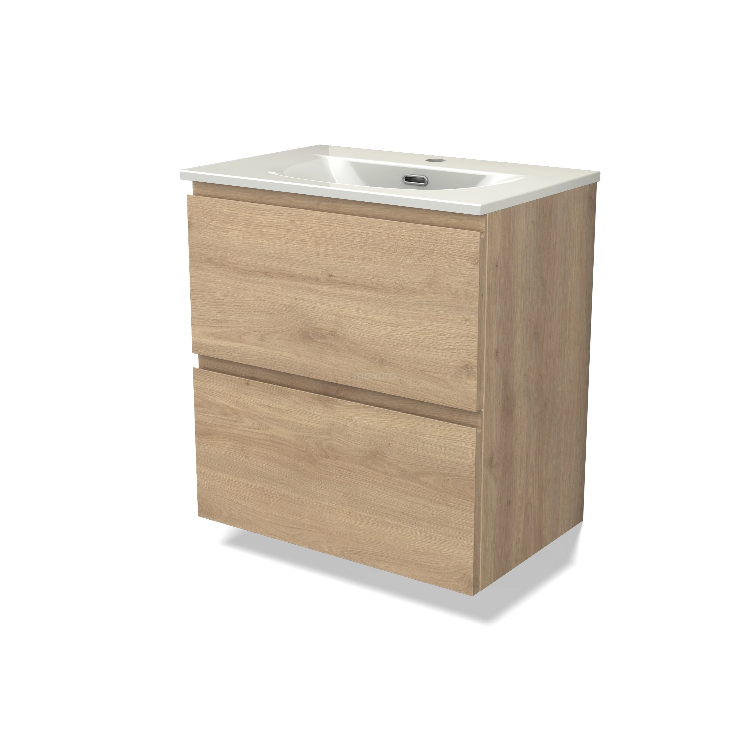 Modulo Slim Waschtische | 60 cm Hellbraune Eiche Grifflos front Keramik 2 übereinanderliegende Schubladen