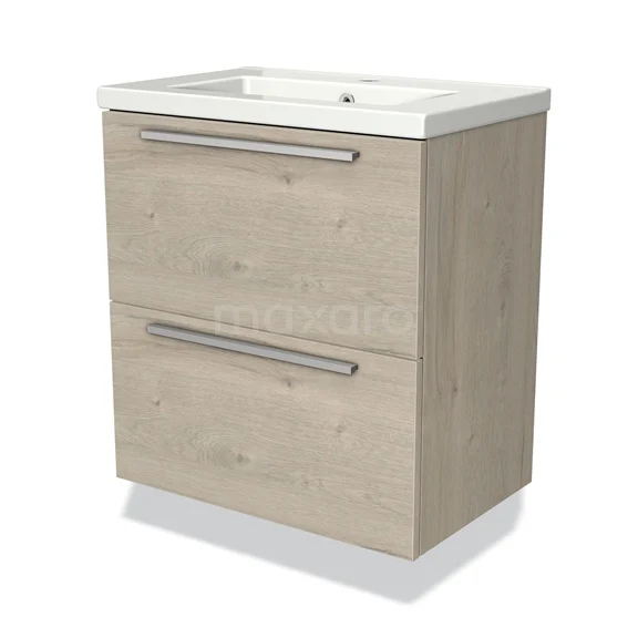 Modulo Slim Waschtische | 60 cm Hellgraue Eiche Flach front Keramik 2 übereinanderliegende Schubladen