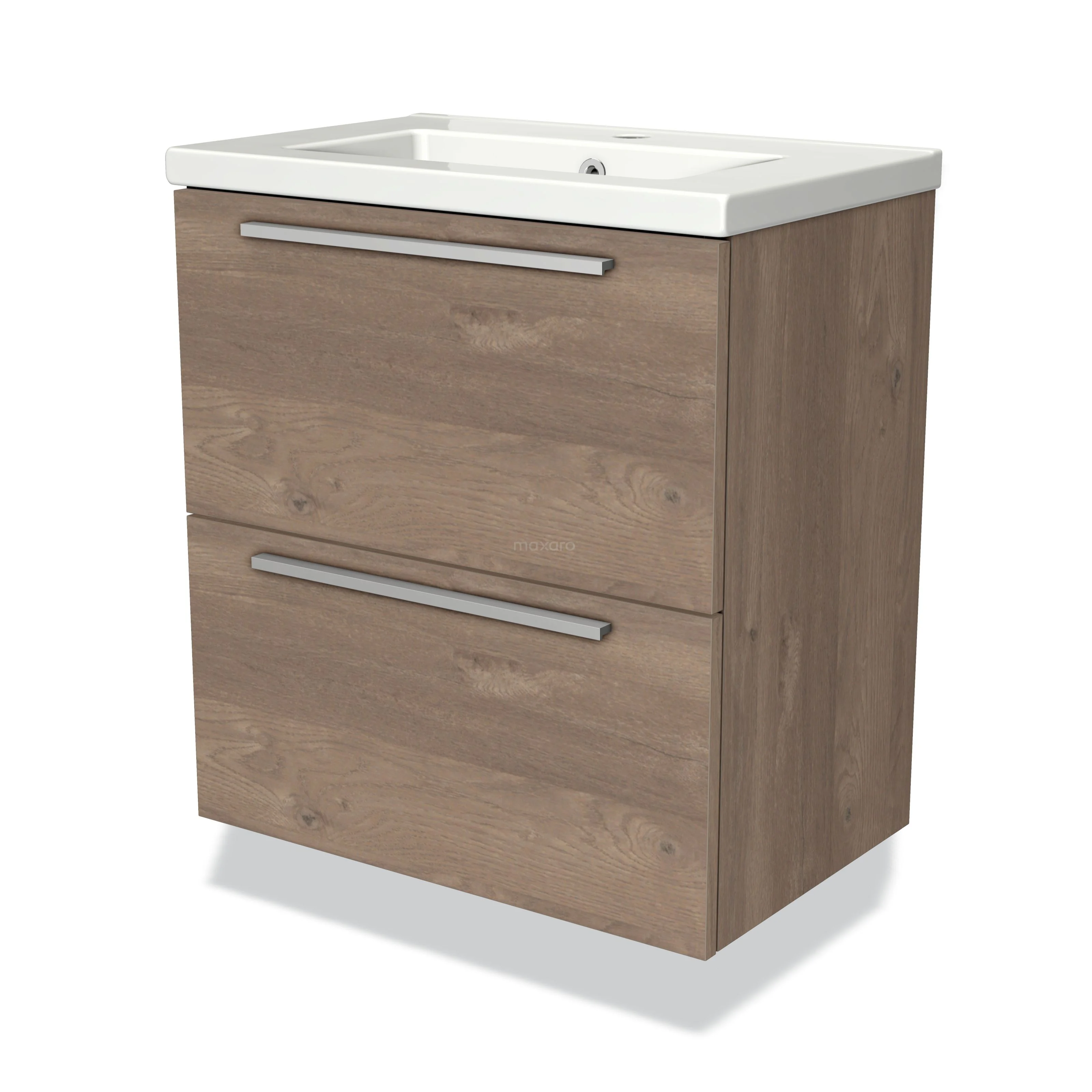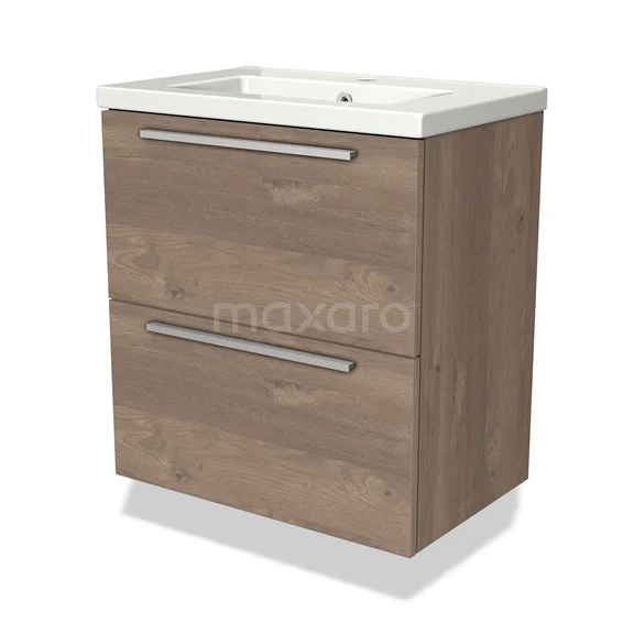 Modulo Slim Waschtische | 60 cm Mittelbraune Eiche Flach front Keramik 2 übereinanderliegende Schubladen