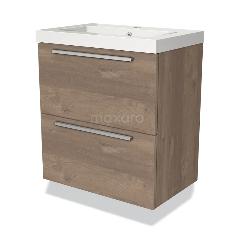 Modulo Slim Waschtische | 60 cm Mittelbraune Eiche Flach front Mineralguss 2 übereinanderliegende Schubladen