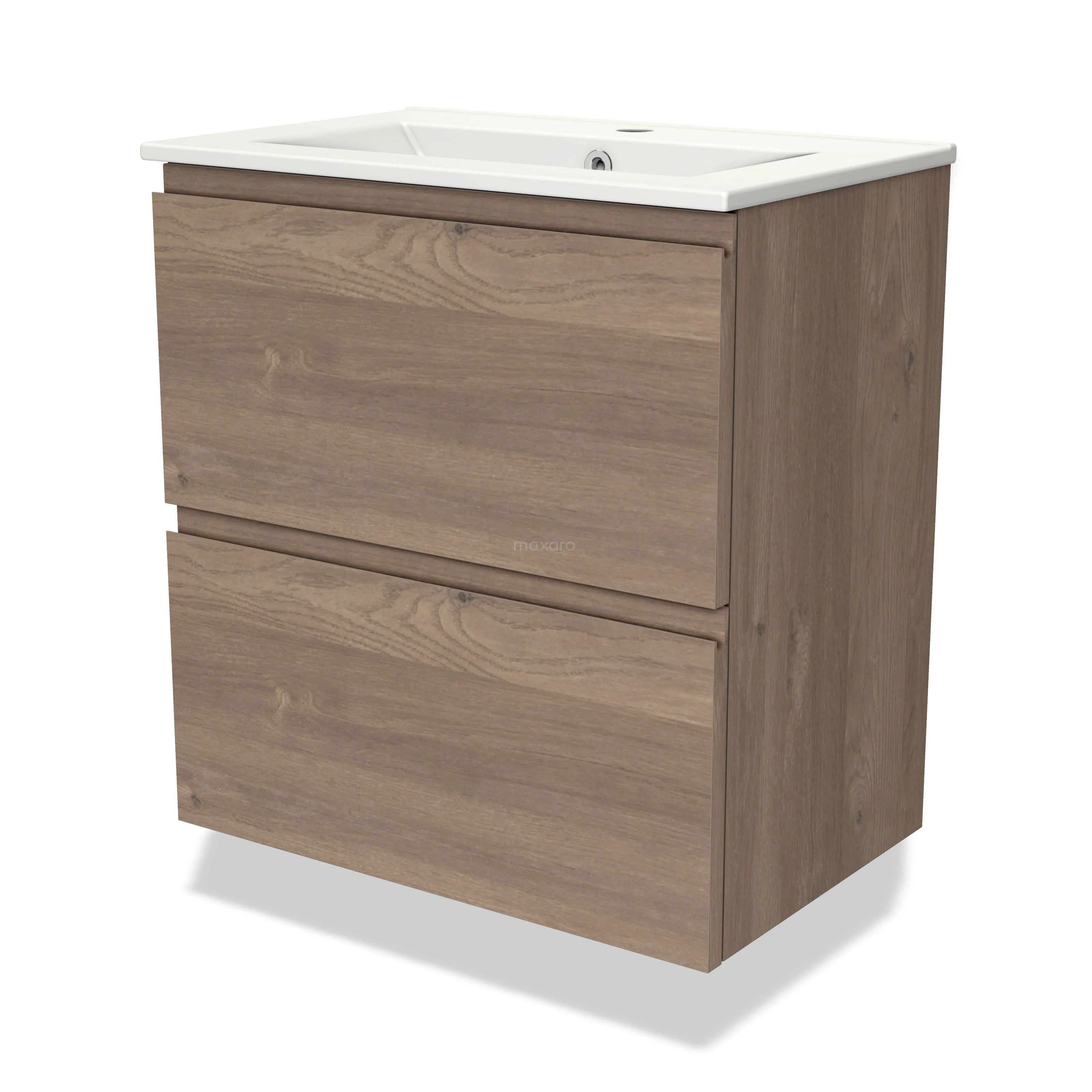 Modulo Slim Waschtische | 60 cm Mittelbraune Eiche Grifflos front Keramik 2 übereinanderliegende Schubladen