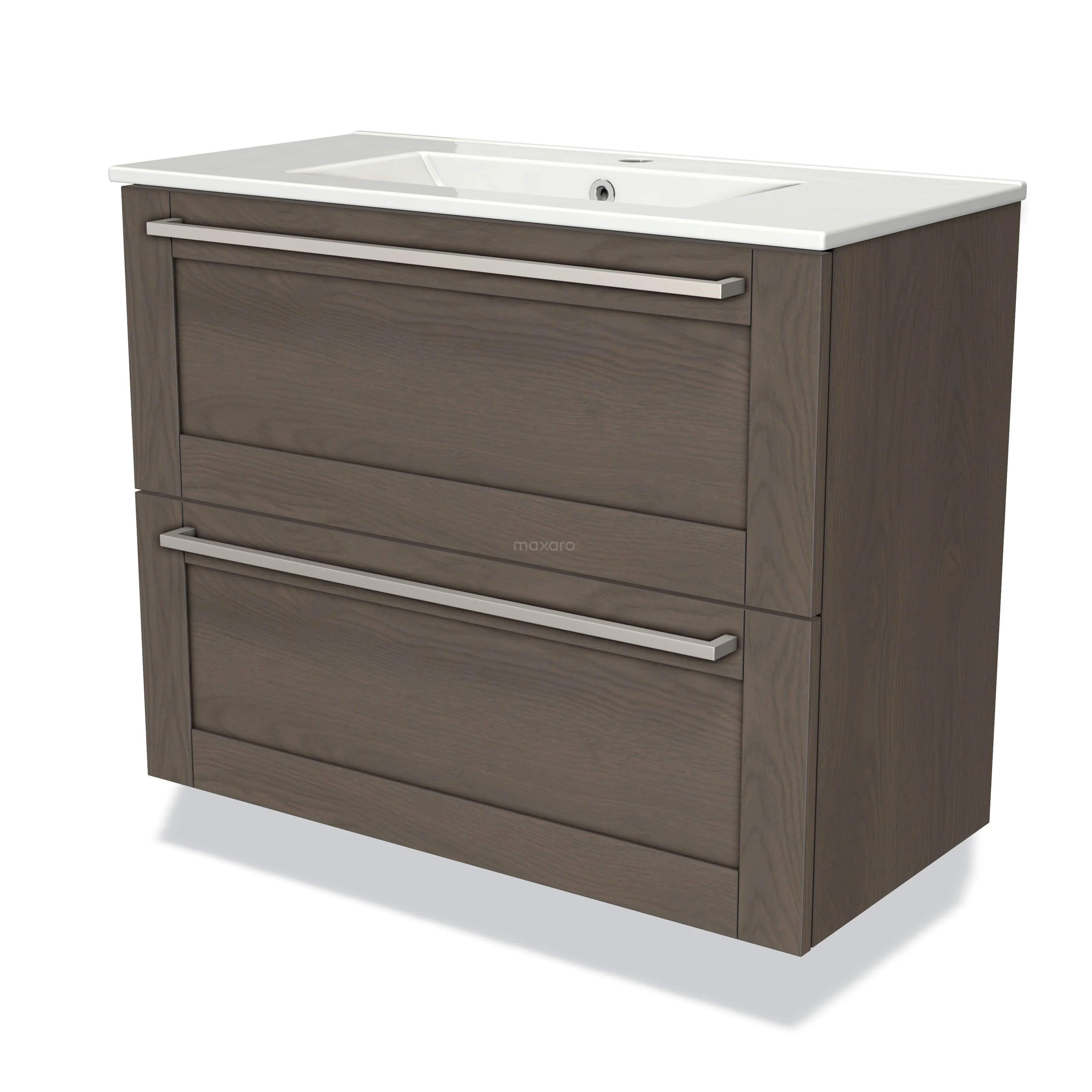 Modulo Slim Waschtische | 80 cm Dunkelbraune Eiche Rahmen front Keramik 2 übereinanderliegende Schubladen