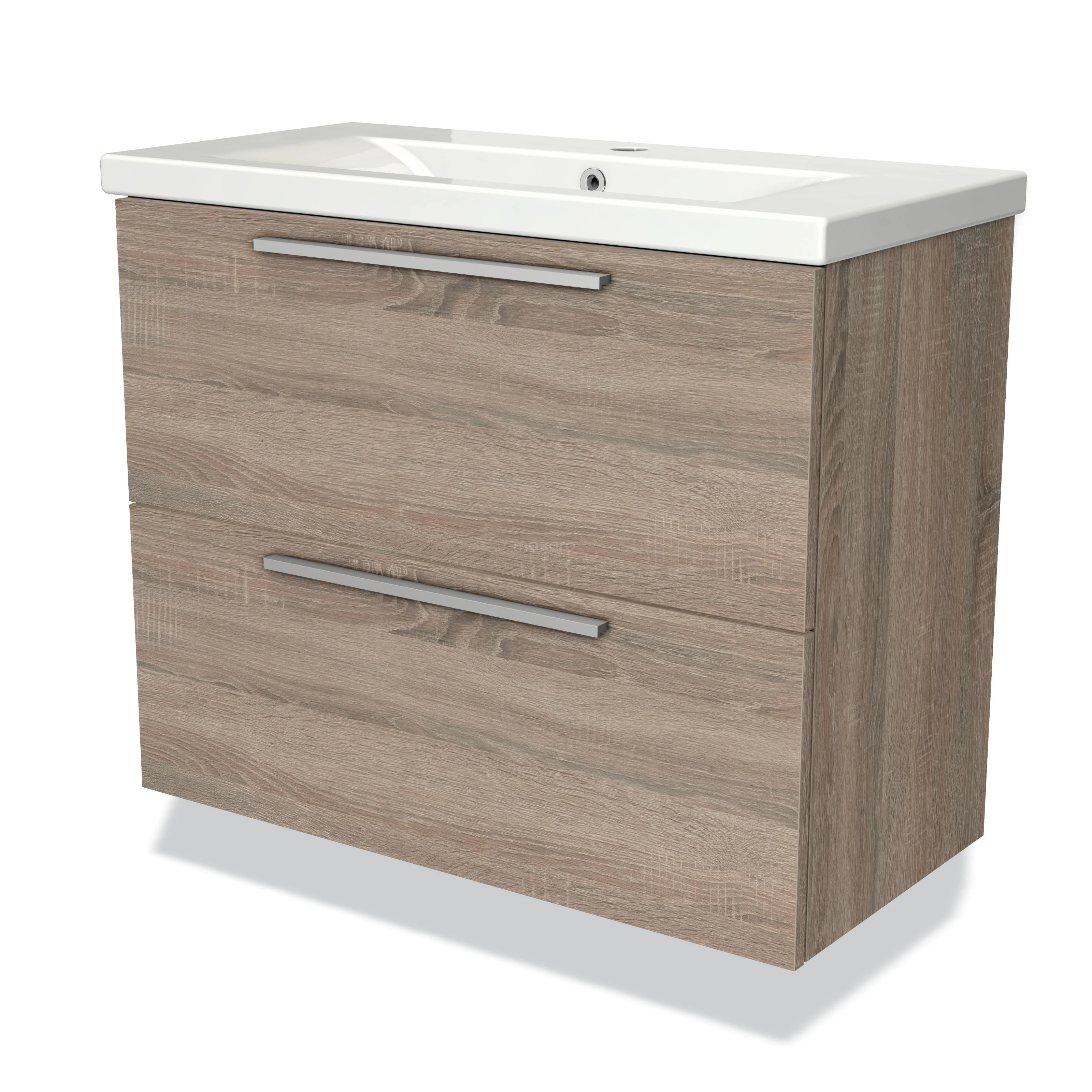 Modulo Slim Waschtische | 80 cm Eiche Flach front Keramik 2 übereinanderliegende Schubladen
