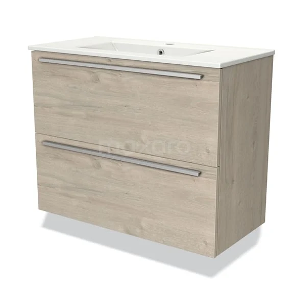 Modulo Slim Waschtische | 80 cm Hellgraue Eiche Flach front Keramik 2 übereinanderliegende Schubladen