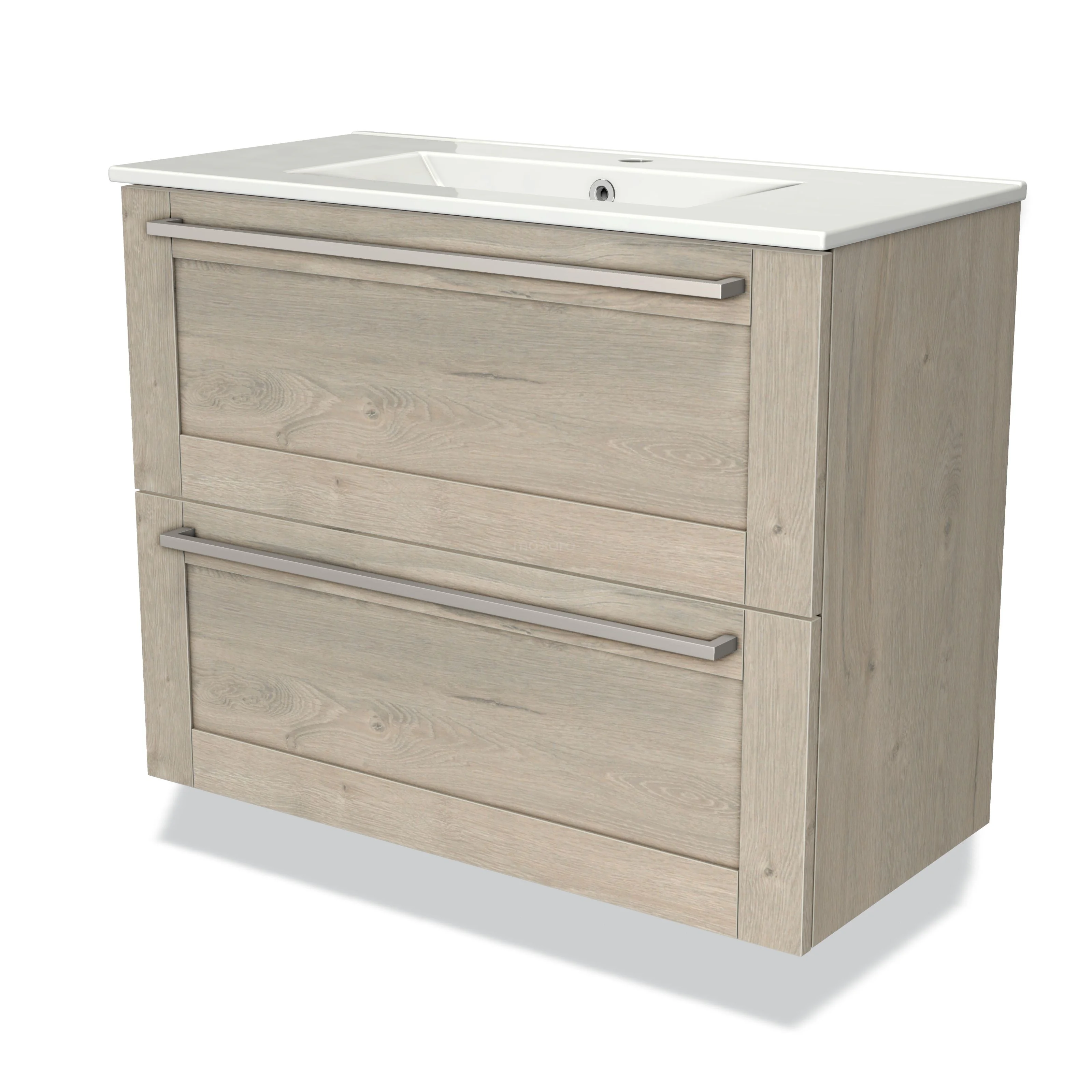 Modulo Slim Waschtische | 80 cm Hellgraue Eiche Rahmen front Keramik 2 übereinanderliegende Schubladen