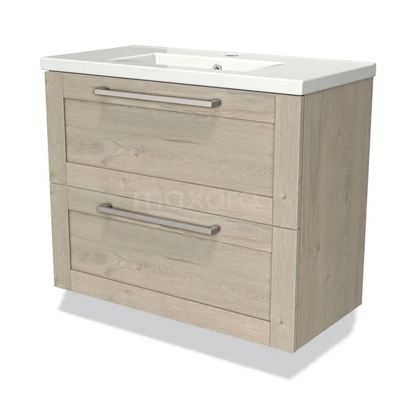 Modulo Slim Waschtische | 80 cm Hellgraue Eiche Rahmen front Keramik 2 übereinanderliegende Schubladen