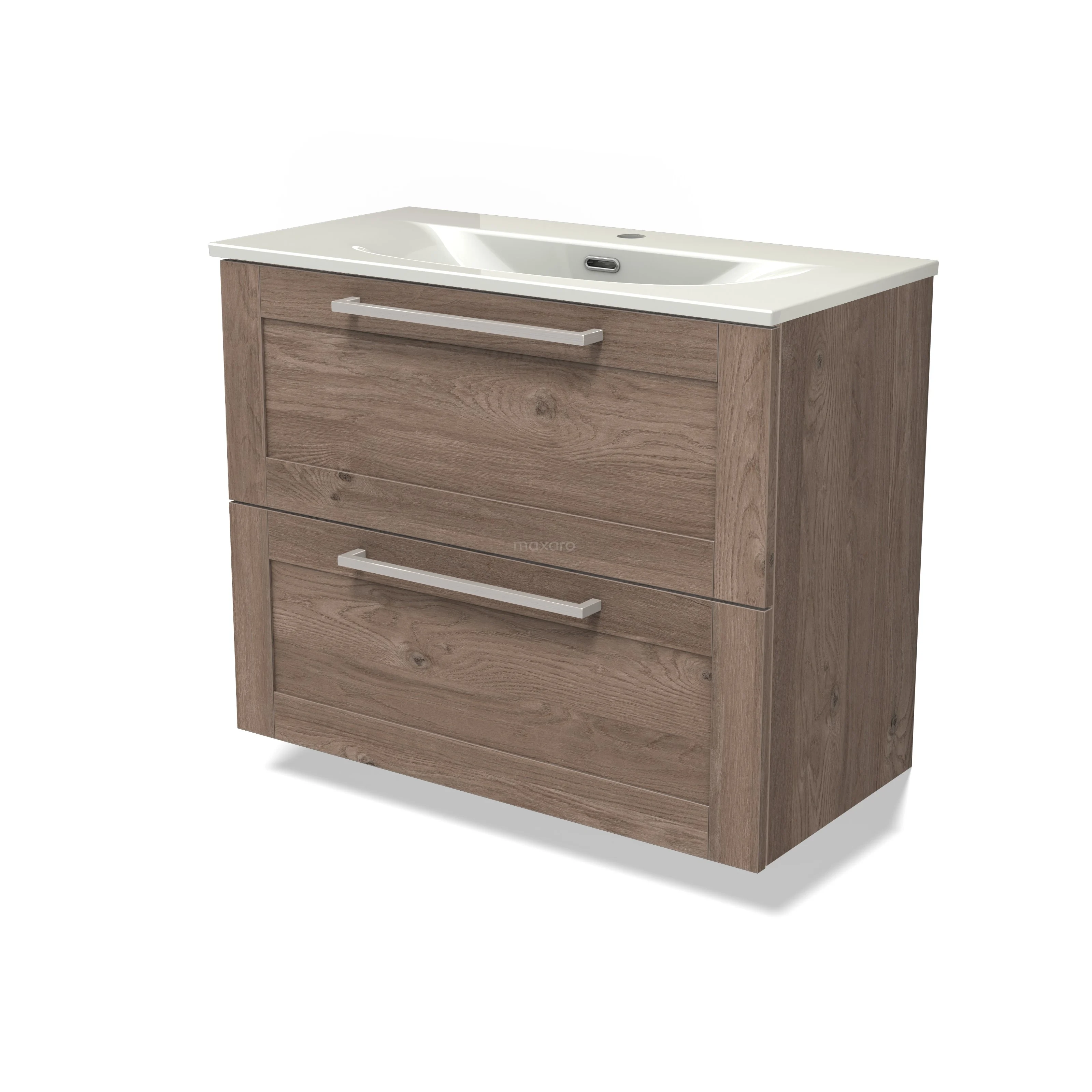 Modulo Slim Waschtische | 80 cm Mittelbraune Eiche Rahmen front Keramik 2 übereinanderliegende Schubladen
