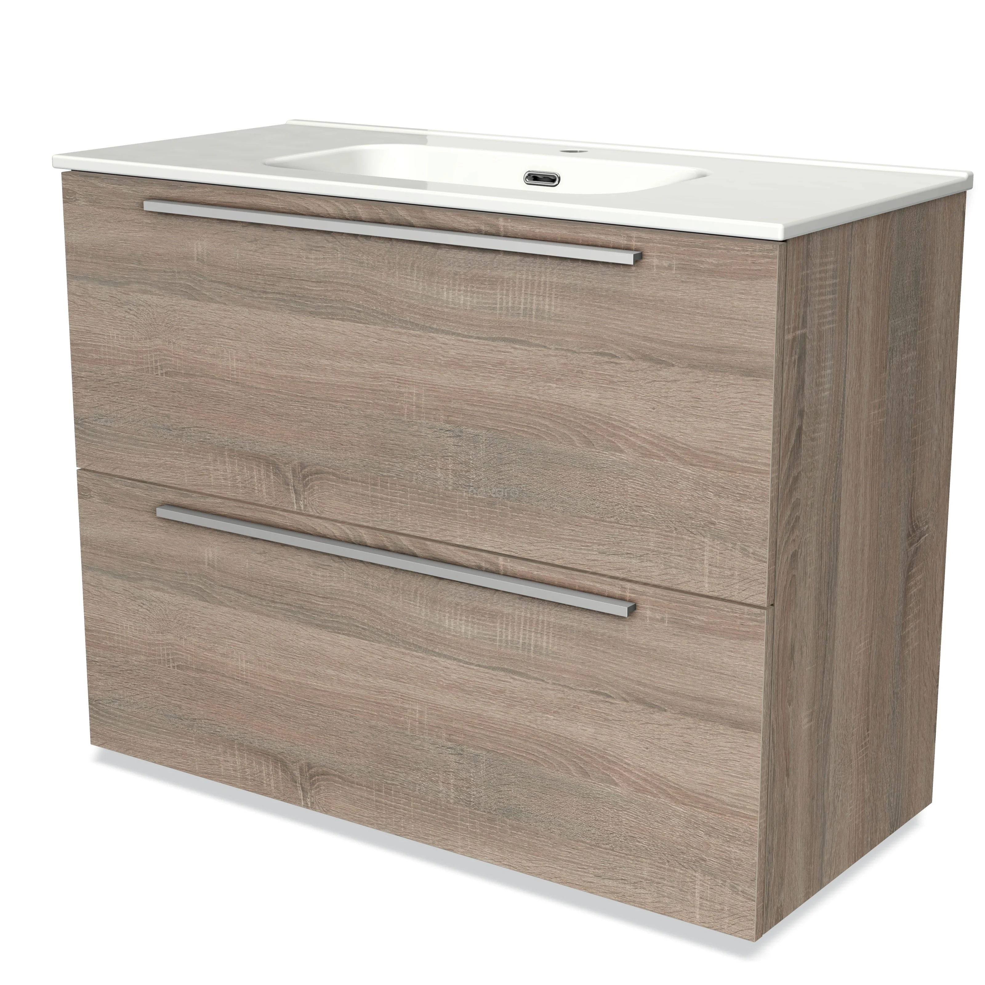 Modulo Waschtische | 100 cm Eiche Flach front Keramik 2 hohe Schubladen übereinanderliegend