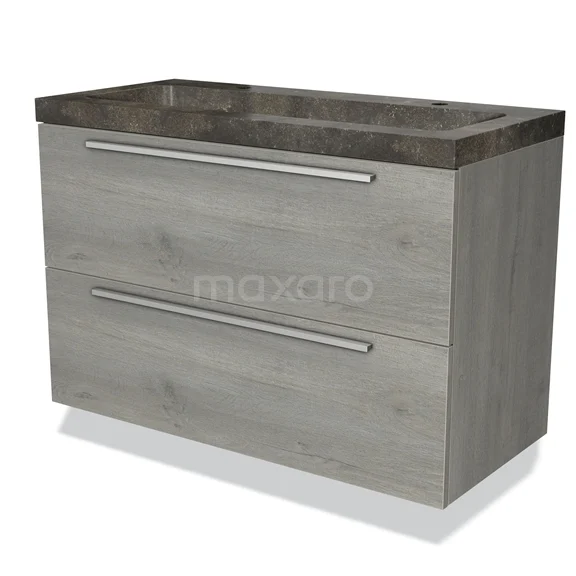 Modulo Waschtische | 100 cm Graue Eiche Flach front Naturstein 2 übereinanderliegende Schubladen