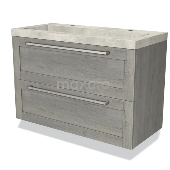 Modulo Waschtische | 100 cm Graue Eiche Rahmen front Beton 2 übereinanderliegende Schubladen