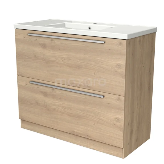 Modulo Waschtische | 100 cm Hellbraune Eiche Flach front Keramik 2 hohe Schubladen übereinanderliegend
