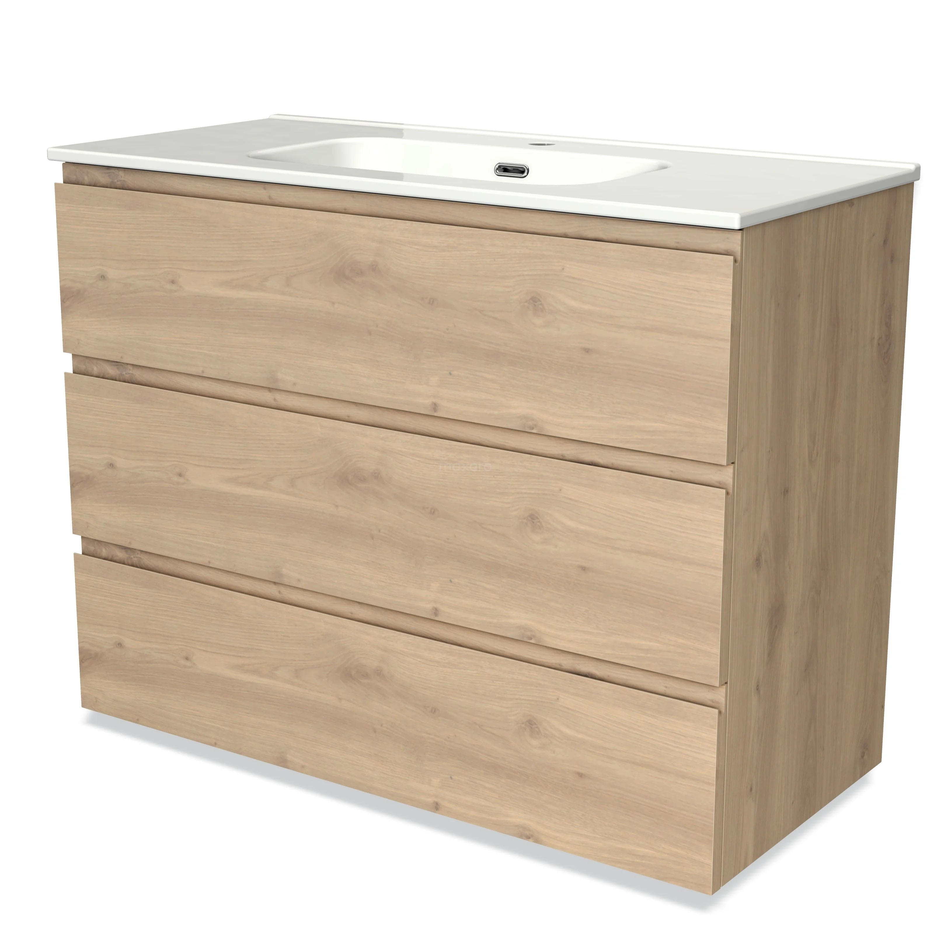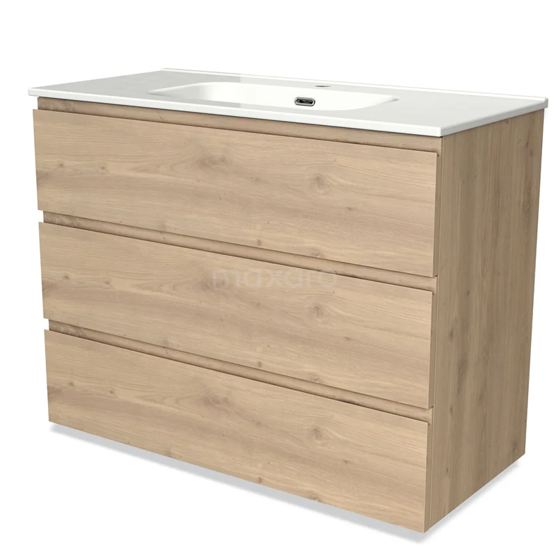 Modulo Waschtische | 100 cm Hellbraune Eiche Grifflos front Keramik 3 Schubladen