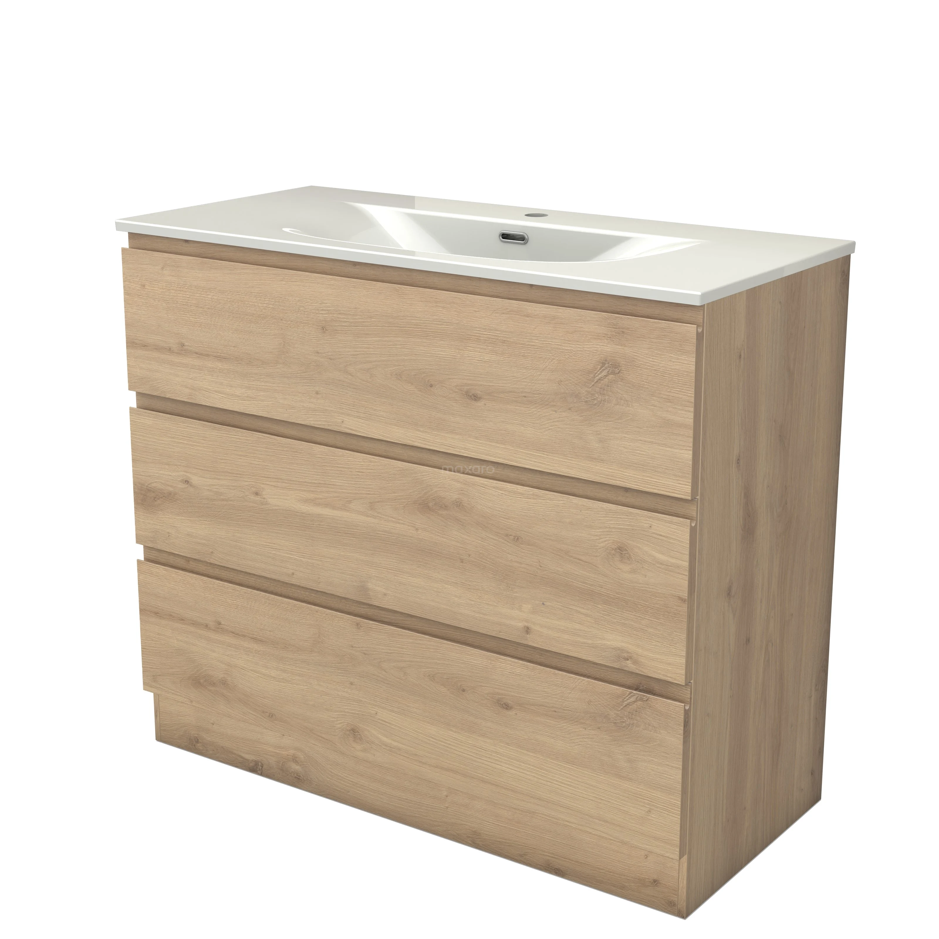 Modulo Waschtische | 100 cm Hellbraune Eiche Grifflos front Keramik 3 stehende Schubladen