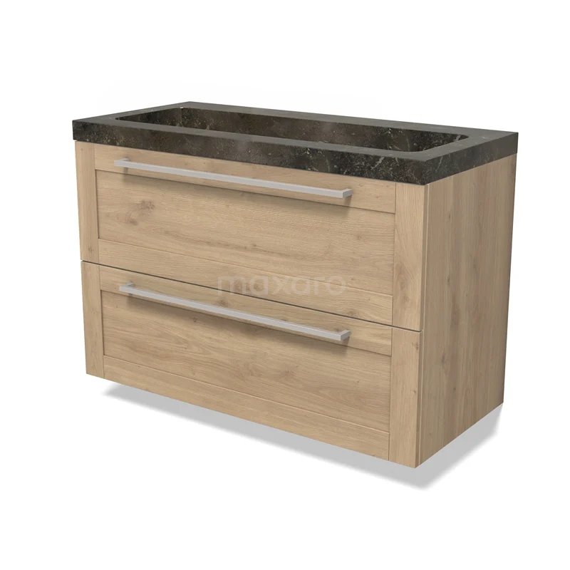 Modulo Waschtische | 100 cm Hellbraune Eiche Rahmen front Naturstein 2 übereinanderliegende Schubladen