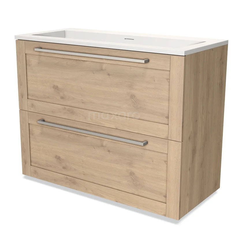 Modulo Waschtische | 100 cm Hellbraune Eiche Rahmen front Solid Surface 2 hohe Schubladen übereinanderliegend