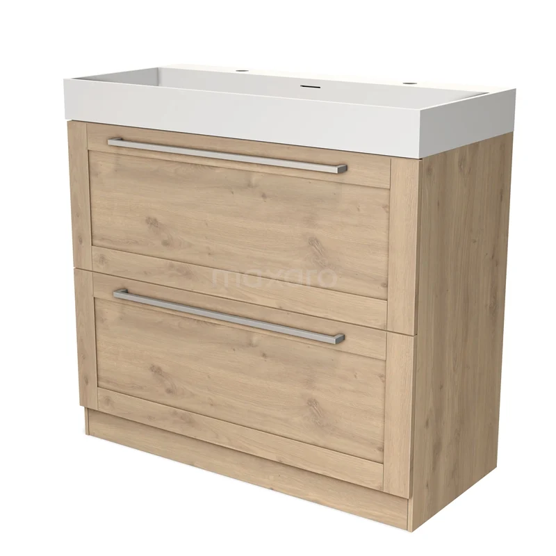 Modulo Waschtische | 100 cm Hellbraune Eiche Rahmen front Solid Surface 2 hohe Schubladen übereinanderliegend
