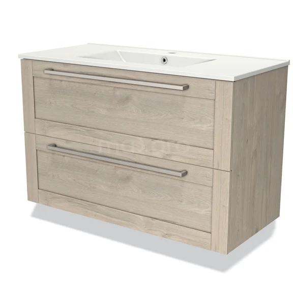 Modulo Waschtische | 100 cm Hellgraue Eiche Rahmen front Keramik 2 übereinanderliegende Schubladen