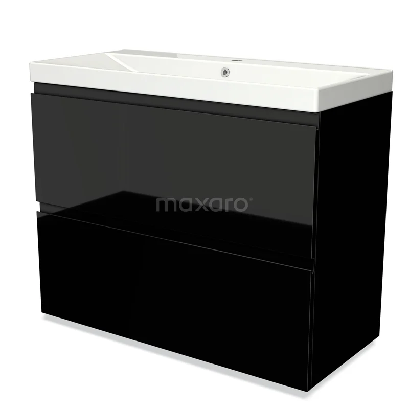 Modulo Waschtische | 100 cm Hochglanz Schwarz Grifflos front Keramik 2 hohe Schubladen übereinanderliegend