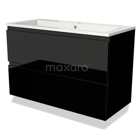 Modulo Waschtische | 100 cm Hochglanz Schwarz Grifflos front Mineralguss 2 übereinanderliegende Schubladen