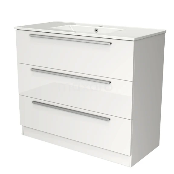 Modulo Waschtische | 100 cm Hochglanz Weiß Flach front Keramik 3 stehende Schubladen