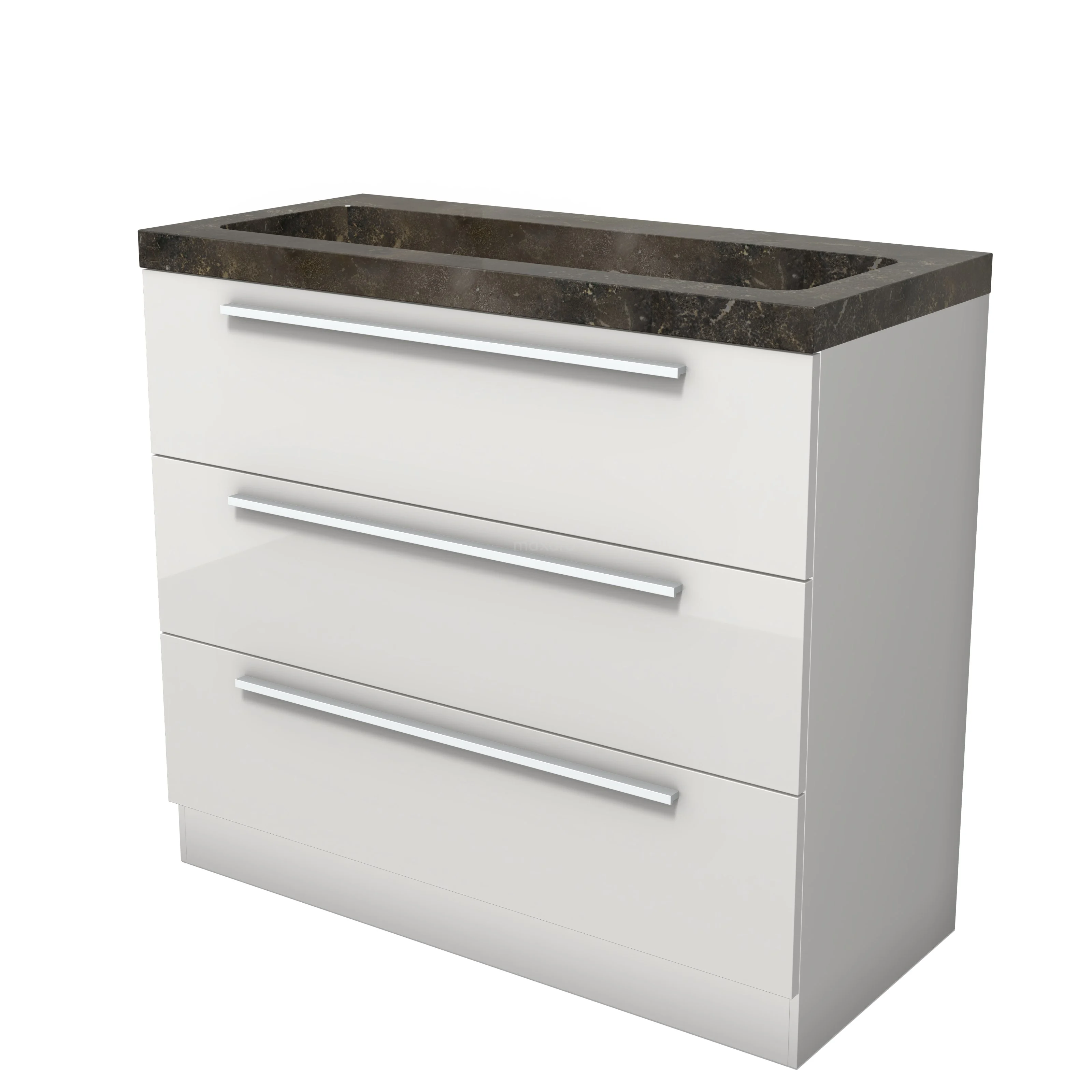 Modulo Waschtische | 100 cm Hochglanz Weiß Flach front Naturstein 3 stehende Schubladen