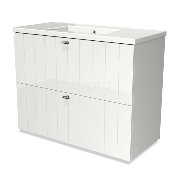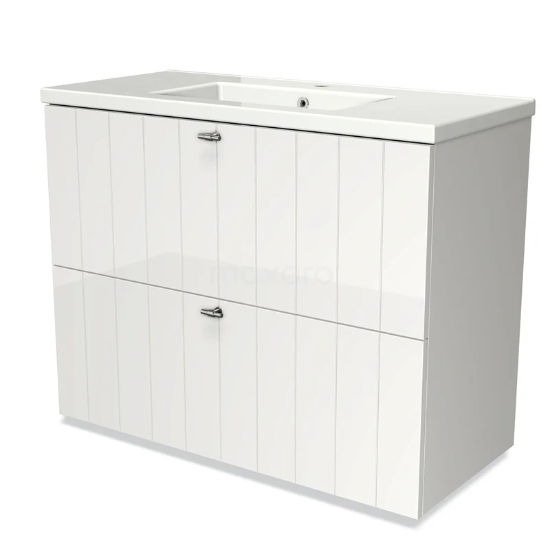 Modulo Waschtische | 100 cm Hochglanz Weiß Lamelle front Keramik 2 hohe Schubladen übereinanderliegend