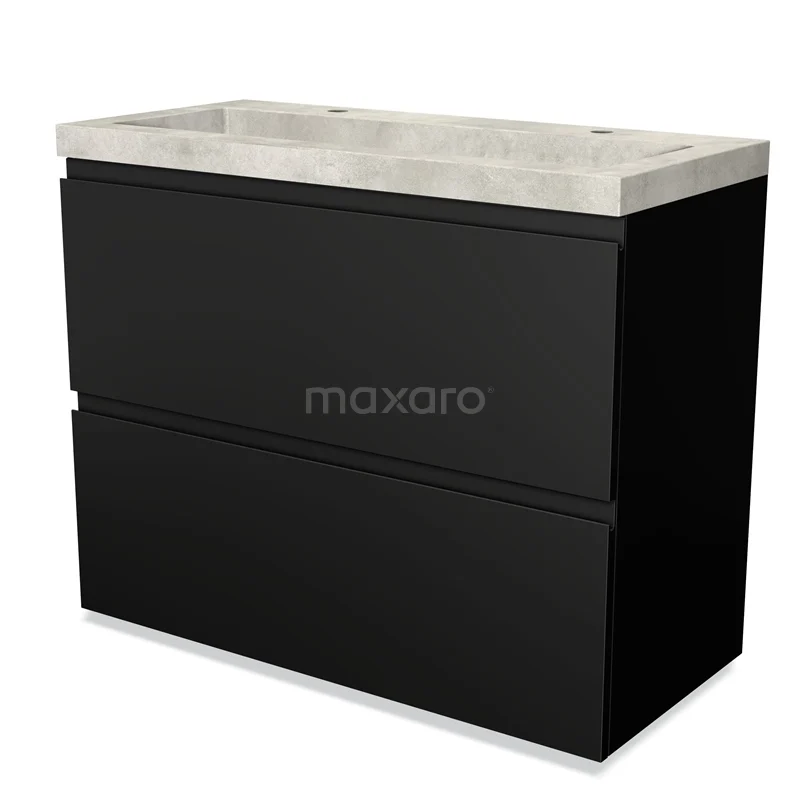 Modulo Waschtische | 100 cm Matt Schwarz Grifflos front Beton 2 hohe Schubladen übereinanderliegend