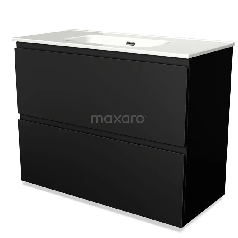 Modulo Waschtische | 100 cm Matt Schwarz Grifflos front Keramik 2 hohe Schubladen übereinanderliegend