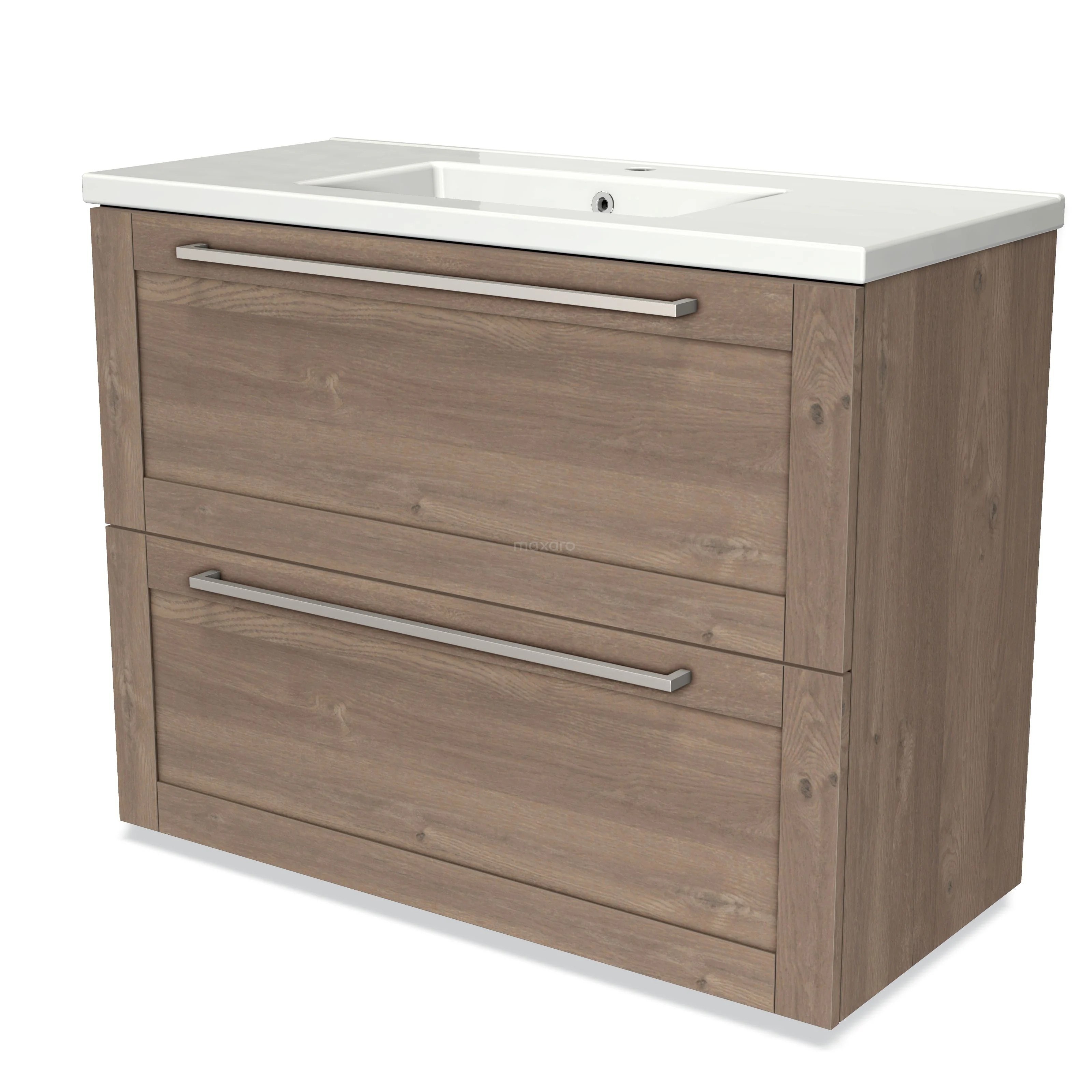 Modulo Waschtische | 100 cm Mittelbraune Eiche Rahmen front Keramik 2 hohe Schubladen übereinanderliegend