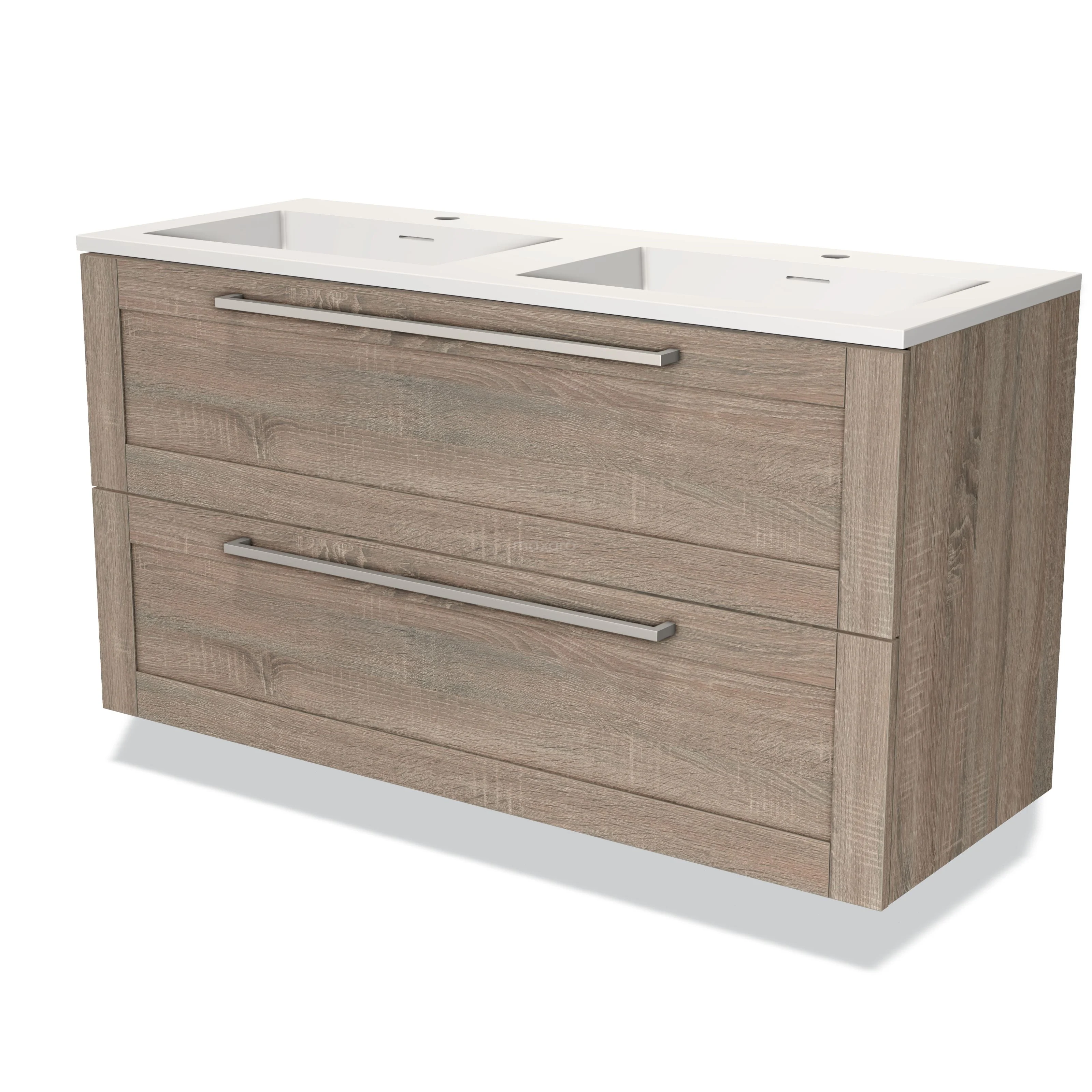 Das bodenstehende Badmöbel (120 cm) ist das Herzstück für die tägliche Körperpflege wie Schminken, Rasieren oder Zähneputzen. Das Waschbecken hat 2 Hahnlöcher und ist ideal für die gleichzeitige Nutzung durch mehrere Personen. Das Möbel bietet außerdem genügend Platz, um Ihre WC- und Pflegeprodukte ordentlich zu verstauen.