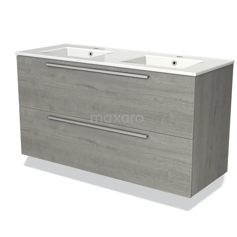 Modulo Waschtische | 120 cm Graue Eiche Flach front Keramik 2 übereinanderliegende Schubladen