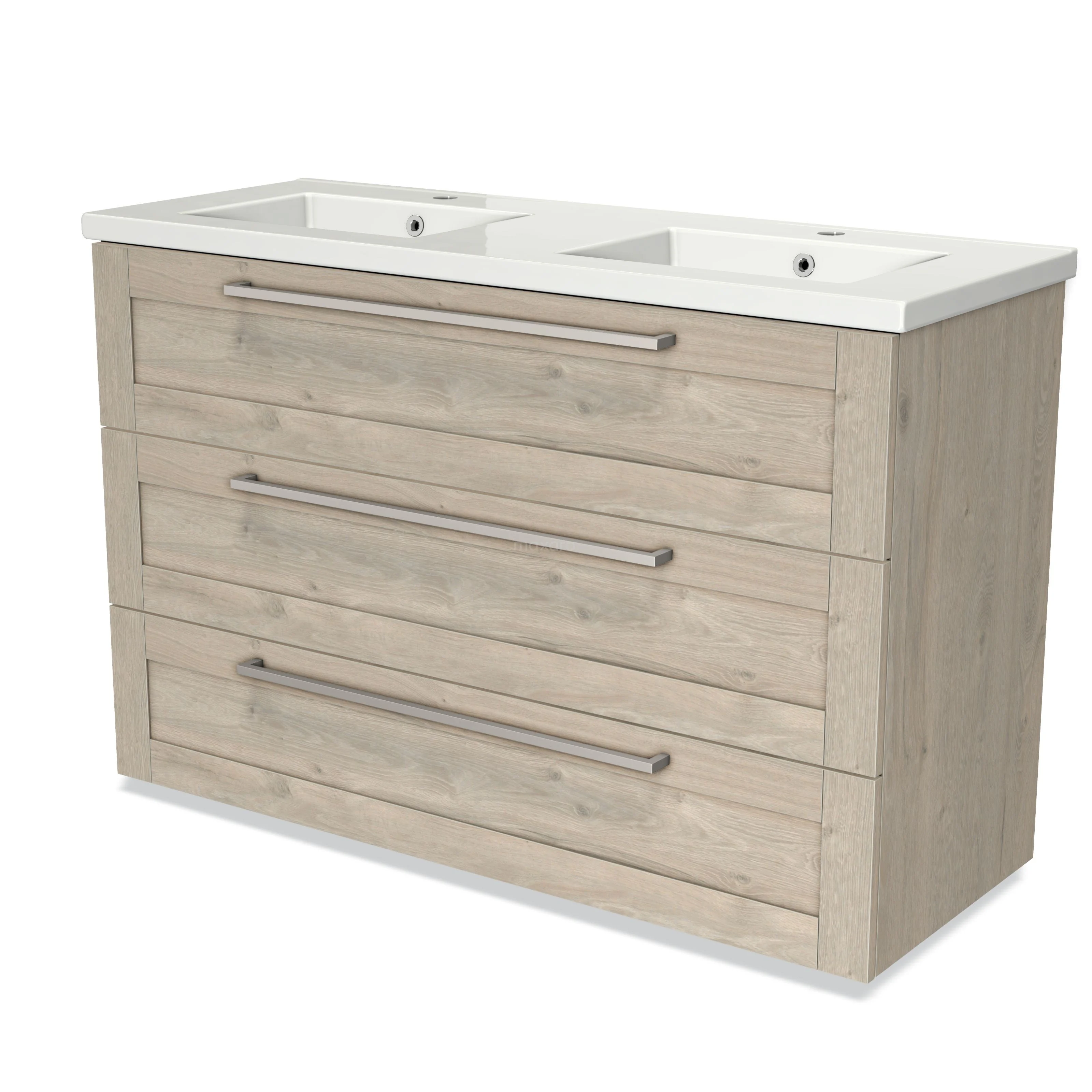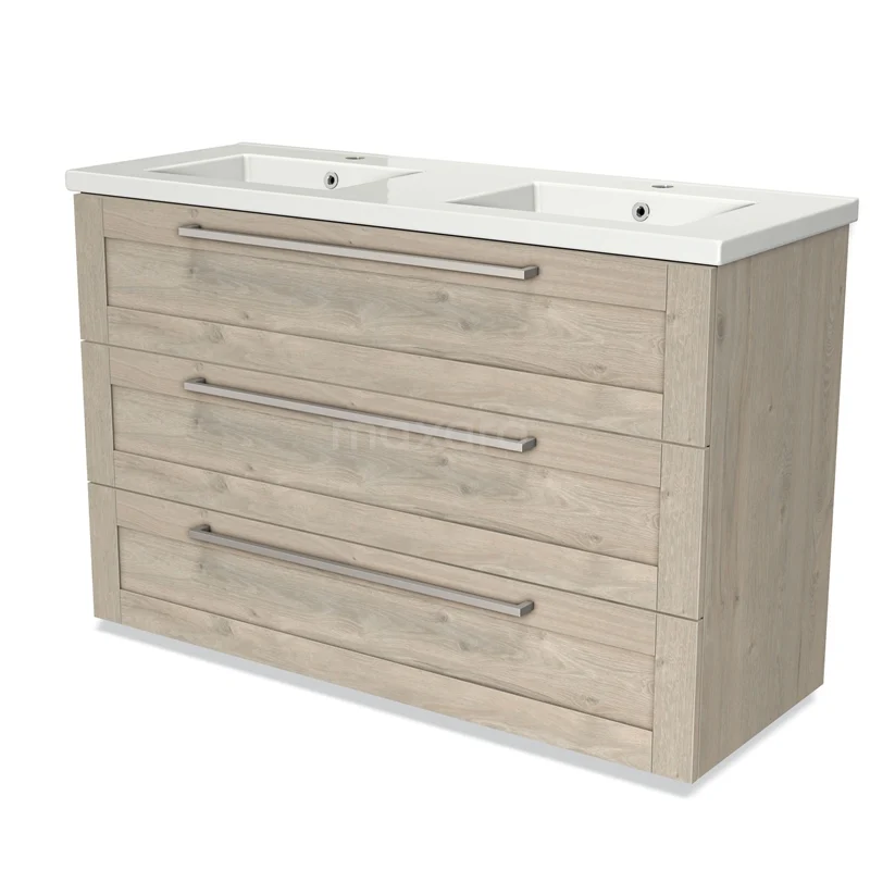 Modulo Waschtische | 120 cm Hellgraue Eiche Rahmen front Keramik 3 Schubladen