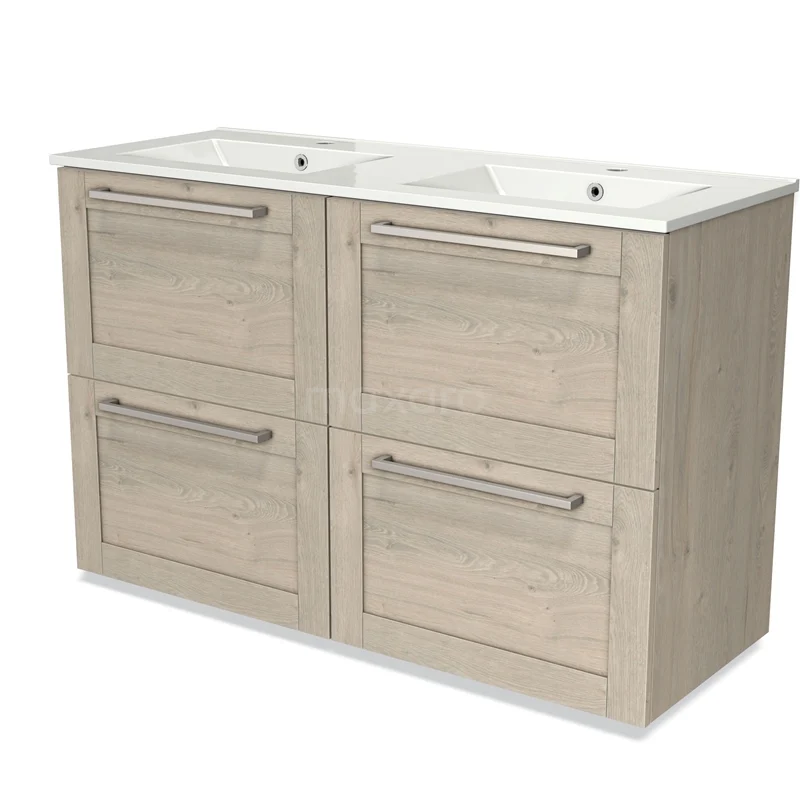 Modulo Waschtische | 120 cm Hellgraue Eiche Rahmen front Keramik 4 hohe Schubladen