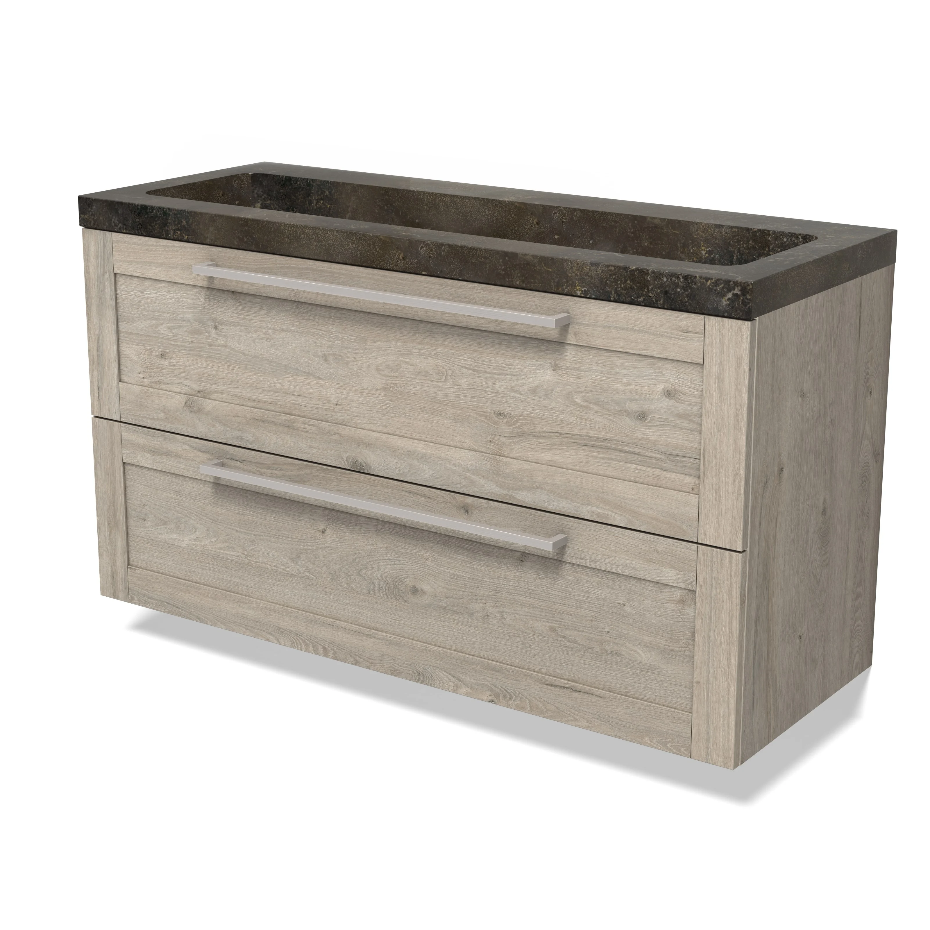 Modulo Waschtische | 120 cm Hellgraue Eiche Rahmen front Naturstein 2 übereinanderliegende Schubladen