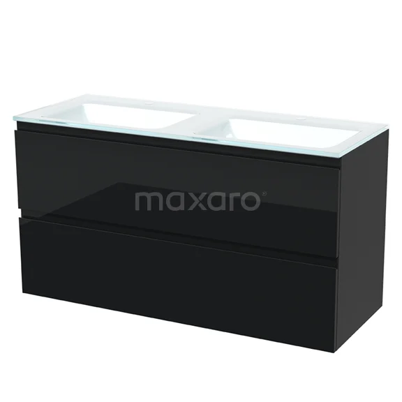 Modulo Waschtische | 120 cm Hochglanz Schwarz Grifflos front Glas 2 übereinanderliegende Schubladen