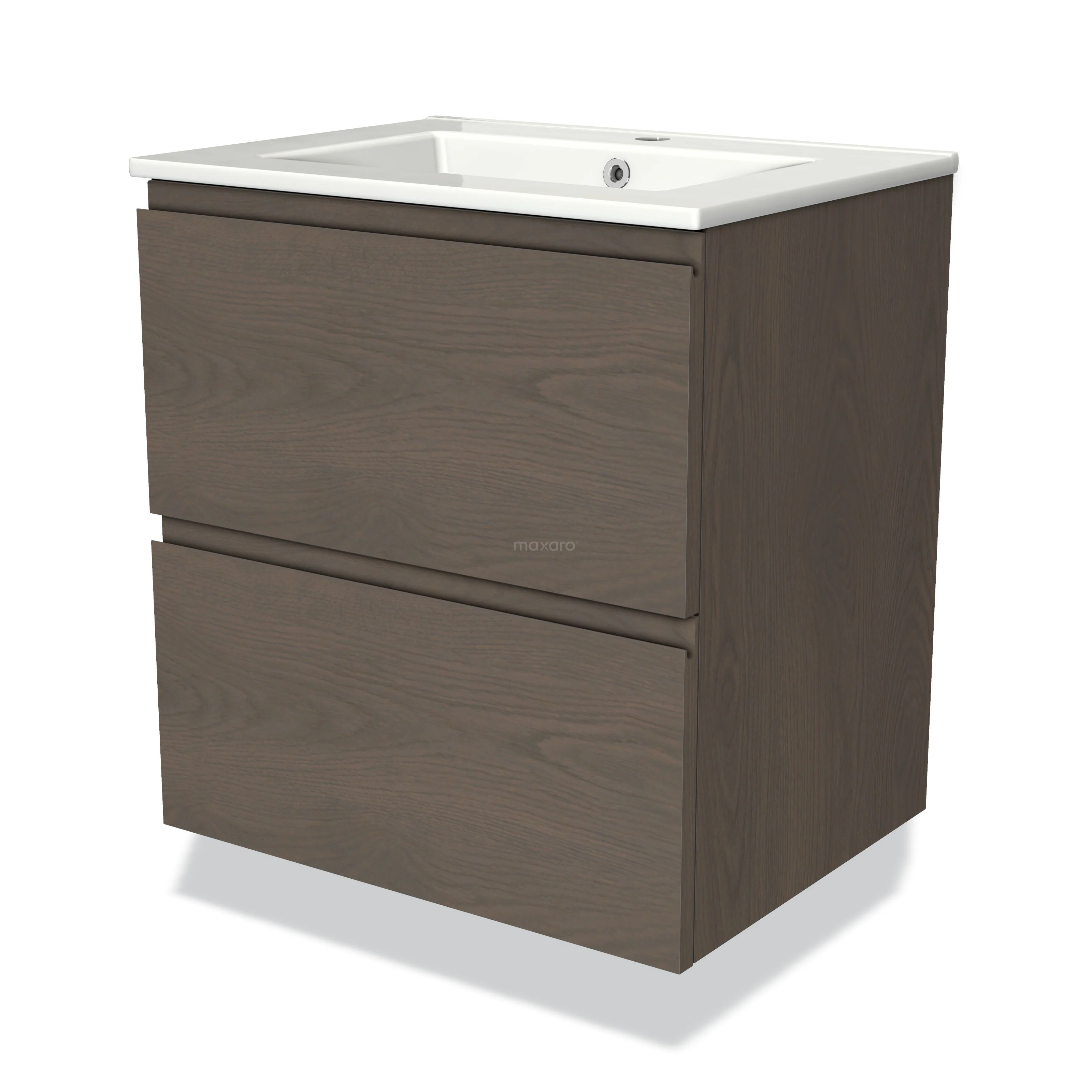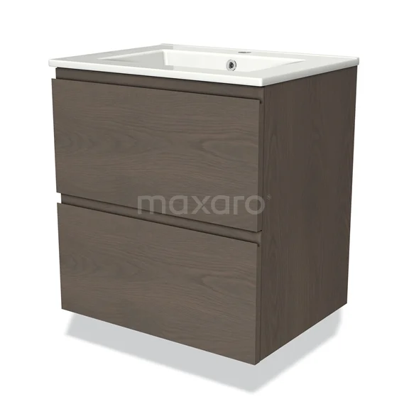 Modulo Waschtische | 60 cm Dunkelbraune Eiche Grifflos front Keramik 2 übereinanderliegende Schubladen