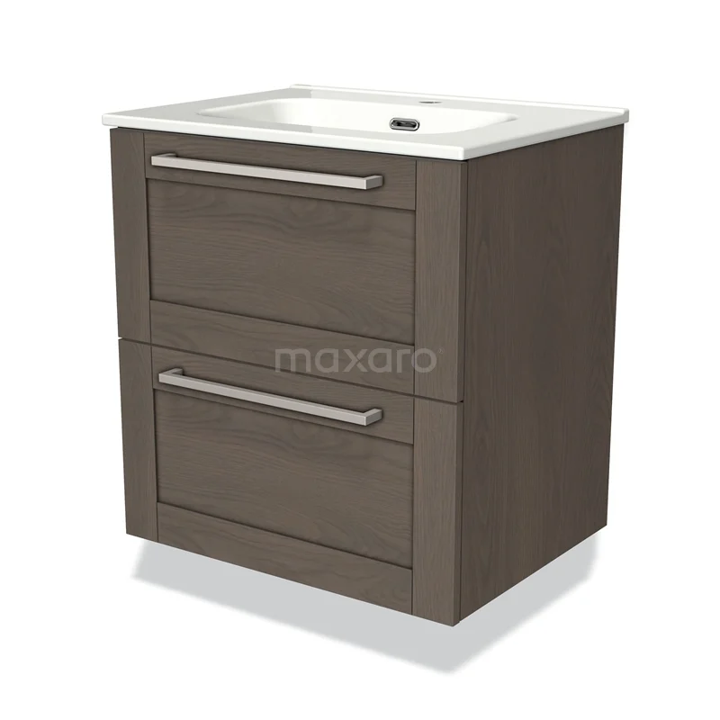 Modulo Waschtische | 60 cm Dunkelbraune Eiche Rahmen front Keramik 2 übereinanderliegende Schubladen